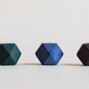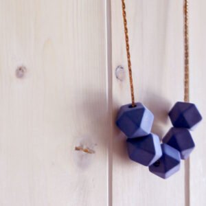 Five geometric cuboctahedron beads with a matte, cobalt blue finish rest along the end a mid-century brass chain to form a bold, geometric catenary. These beads have an amazing weight and a velvety sandstone-like texture.